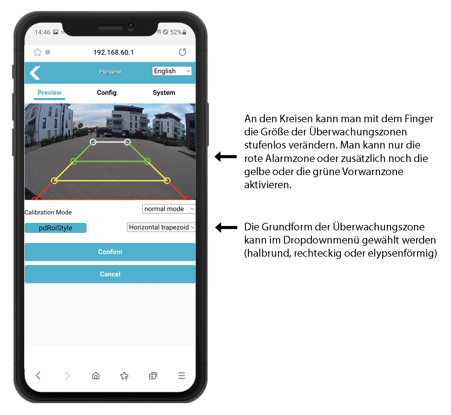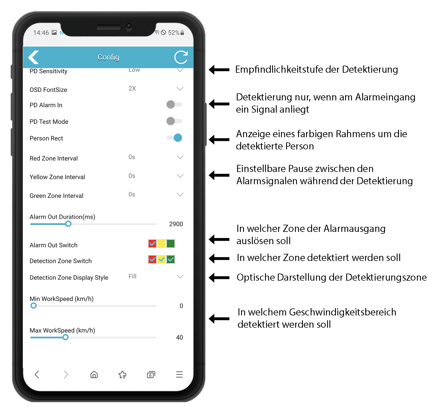 - 3 frei definierbare Erkennungszonen (getrennt ein-ausschaltbar sowie in der Darstellung wählbar)